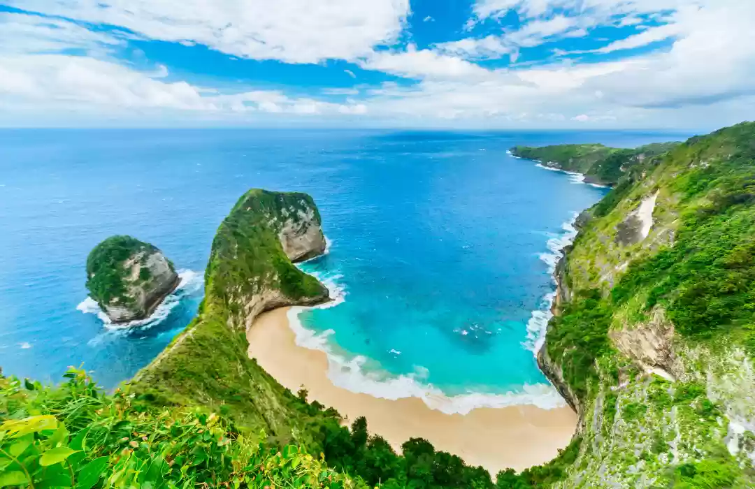 Kelingking Beach, on Nusa Penida Island, Indonesia, is famed for its T-Rex shaped cliff that plunges dramatically into turquoise waters below. The secluded beach boasts pristine white sands and offers breathtaking panoramic views, making it a must-visit destination for nature enthusiasts and adventurers seeking awe-inspiring landscapes.