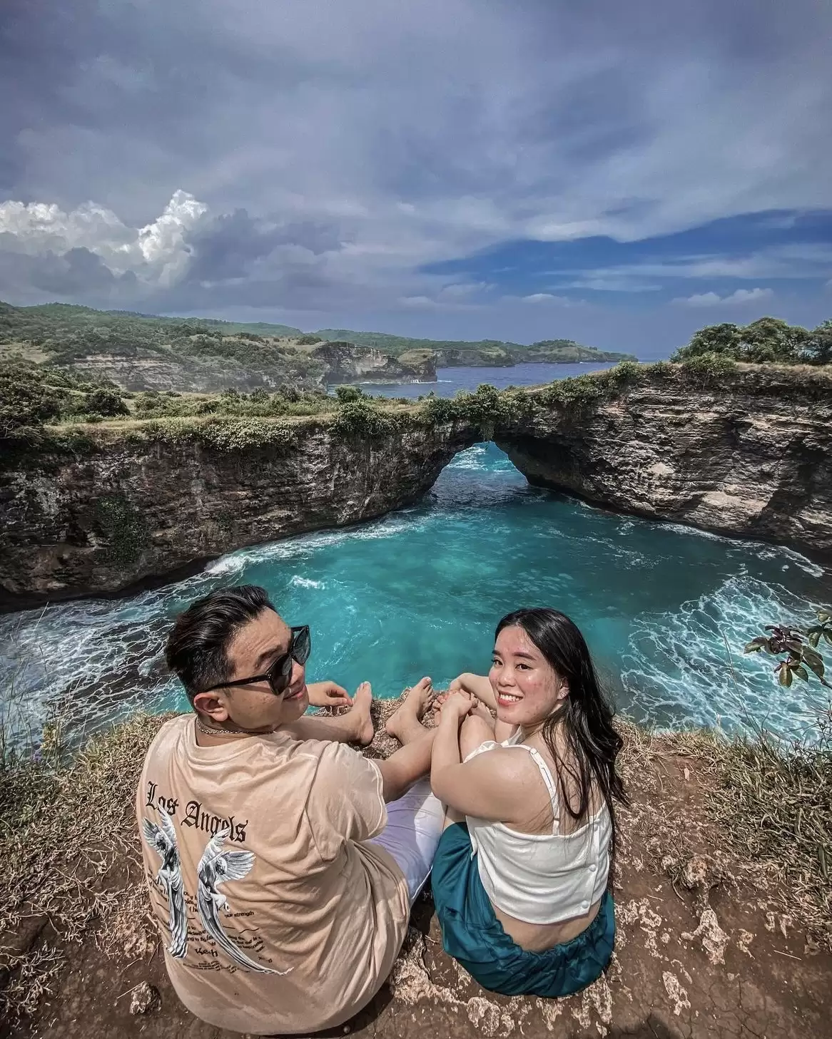 Broken Beach, also known as Pasih Uug, is a natural marvel located along Nusa Penida's southwestern coast. Unlike traditional beaches, Broken Beach is renowned for its dramatic geological formation, featuring a natural archway that spans over crystal-clear waters. The circular bay is encircled by steep cliffs that protect the pool-like formation below, creating a unique and mesmerizing sight. Visitors can admire the natural bridge from viewpoints above or venture down to the rocky shore for a closer look at the turquoise waters and rugged cliffs. Broken Beach is a testament to Nusa Penida's geological diversity and offers a captivating backdrop for photography and exploration.